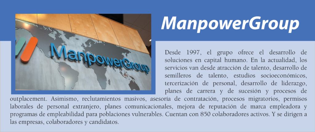 Durante los últimos 70 años, la firma de capital humano global, ManpowerGroup, se encuentra activa en más de 80 países y territorios. Su principal actividad ha sido el desarrollo de capital humano, así también han incursionado en la generación de estudios que den una guía práctica a las personas y empresas de hacia dónde se dirige el mercado laboral.