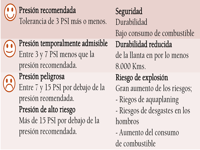 - La presión baja provoca una reducción del 30% en la durabilidad de la llanta. Presión baja es igual a mayor velocidad de desgaste y mayor sobrecarga de la banda de rodamiento en el suelo.