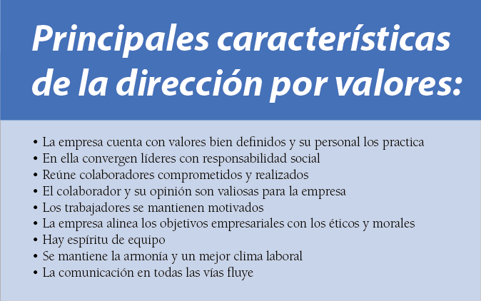 La dirección por valores es la que prioriza la ética en la gestión empresarial. Es una forma de liderazgo con compromiso y con responsabilidad social. Con ello se logran equipos motivados y dispuestos a dar el máximo rendimiento para contribuir a la productividad de la organización. De esta forma, la dirección reconoce el trabajo bien realizado, empodera a las personas en sus puestos de trabajo, estimula la creatividad y mantiene abiertos los canales de comunicación para que esta fluya.
