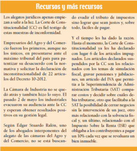 La Cámara del Agro y la de Comercio han interpuesto sendas acciones de inconstitucionalidad contra 22 artículos del decreto 10-2012, de los que la Corte de Constitucionalidad (CC) ya ha declarado suspendidos temporalmente 6.