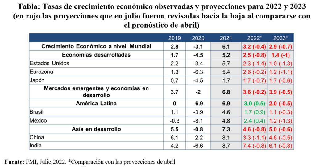 La actualización de las perspectivas económicas lanzada por el Fondo Monetario Internacional (FMI), el 26 de julio, describió el panorama económico mundial como “sombrío y más incierto”. Al comparar las proyecciones realizadas por el FMI en julio con las de abril, se recortó en 40 puntos porcentuales la perspectiva de crecimiento económico del mundo para el cierre de 2022 (situándolo en 3.2%) y la de Estados Unidos fue reducida en 1.4% (situándolo en 2.3%). Ver Tabla 1.