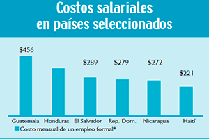 Uno de los factores que grandes inversionistas consideran al momento de seleccionar un país para desarrollar proyectos intensivos en empleo, es el costo de generar y mantener una plaza de trabajo formal. Hoy en día los costos salariales (salario mínimo, prestaciones, indemnización, contribuciones patronales, entre otros) son mayores en Guatemala que en otros países de la región, lo que influye en las decisiones de los inversionistas.