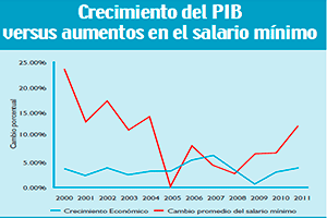 El Código de Trabajo no determina la frecuencia con la que se debe hacer el ajuste del salario mínimo. A pesar de ello, en Guatemala la negociación se realiza de forma anual. Históricamente la fijación del salario mínimo más que una decisión técnica ha sido una decisión política, ya que al final de cada año el Presidente de la República determina el salario mínimo que regirá el año siguiente. Como se aprecia en la Ilustración 4, el crecimiento del salario mínimo no muestra ninguna relación con una variable tan importante como el crecimiento económico del país. Ya que la mayoría de decisiones de fijación salarial han dependido de distintos presidentes de turno, que en ocasiones han querido favorecer al sector trabajador y en otras al sector empleador.