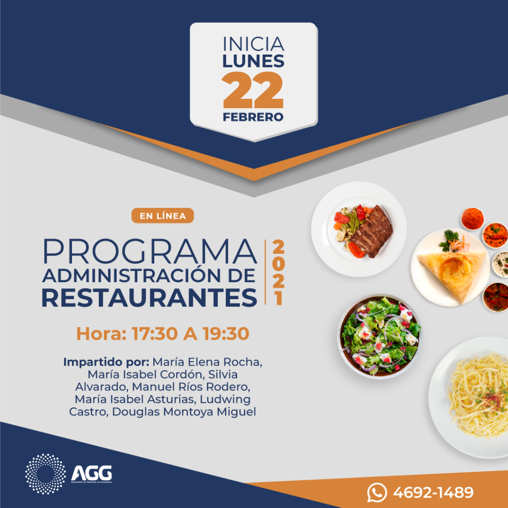 En 2016, nació el programa Administración de Restaurantes como parte del portafolio de capacitación de la AGG. El contenido se estructura en nueve módulos, impartidos en 42 horas, por siete instructores especializados en las diferentes áreas, que este año incluyen marketing digital y protocolo de salud y seguridad ocupacional para restaurantes. Por segundo año consecutivo, la capacitación se realizará de forma virtual.