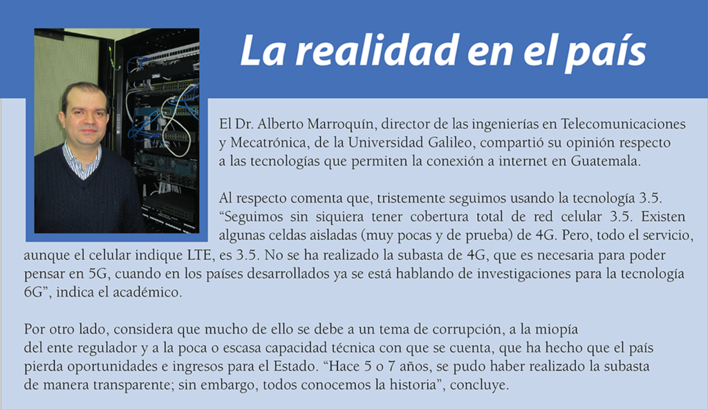 En Guatemala, contamos con las tecnologías 3G, 4G y 4G+ o LTE. Según explica Quiñónez, estamos a la expectativa del 5G, que es la quinta generación de tecnologías y estándares de comunicación inalámbrica; es decir, el internet que utilizan dispositivos como los teléfonos móviles para permitir la conexión a la red en cualquier sitio.