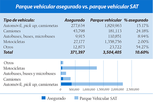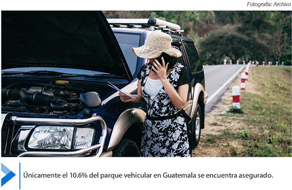 Según datos de la Asociación Guate-malteca de Instituciones de Seguros (AGIS), a diciembre de 2018 el parque vehicular en el país era superior a los 3.5 millones. De esos automotores, únicamente el 10.6% está asegurado, lo que contrasta con la media en Latinoamérica que es del 50-70% del parque vehicular asegurado.