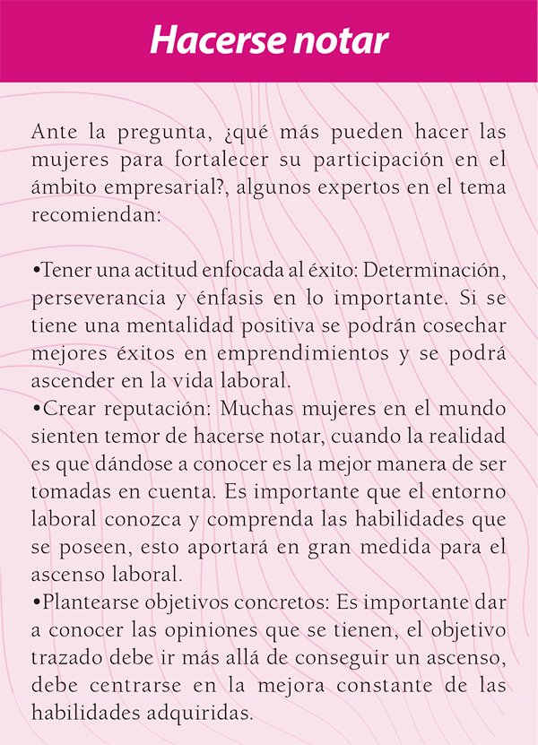 Al respecto, Calvo comenta que en el país aún se observa que muchas mujeres se retiran del ámbito laboral cuando se casan y conforman una familia. Tras 10 o 12 años de crianza de los hijos, les resulta difícil incorporarse nuevamente al mundo laboral-empresarial, comenta. No obstante, también reconoce que otras están abriendo brecha, al asumir la responsabilidad de sacar adelante los negocios que heredan de sus familias. “Cuando las mujeres se motivan y comprueban que están impactando la economía, se sienten satisfechas y se comprometen a aportar más desde la empresa”, dice.