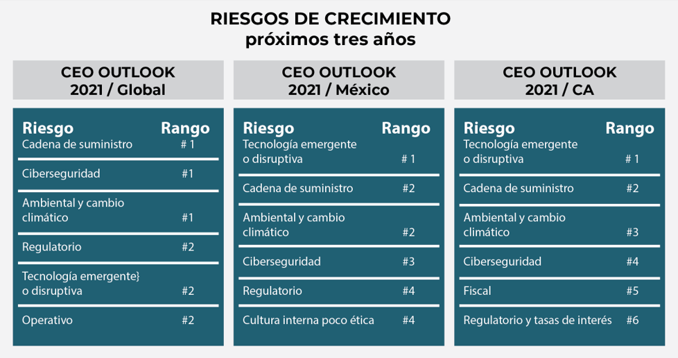 Finalmente, “3 de cada 4 CEO (74%) consideran que la presión ejercida sobre las finanzas públicas por la respuesta a la pandemia ha aumentado la urgencia de la cooperación multilateral en el sistema fiscal global (78% México, 85% Centroamérica). Al mismo tiempo, 77% (76% México, 69% Centroamérica) coincide en que, el régimen fiscal mínimo global propuesto causa inquietud significativa, de cara a los objetivos de crecimiento de su organización. Y esto genera preocupación por los riesgos regulatorios, que ocupan el segundo lugar en el mundo, cuarto en México y sexto en Centroamérica” (Tabla 1).
