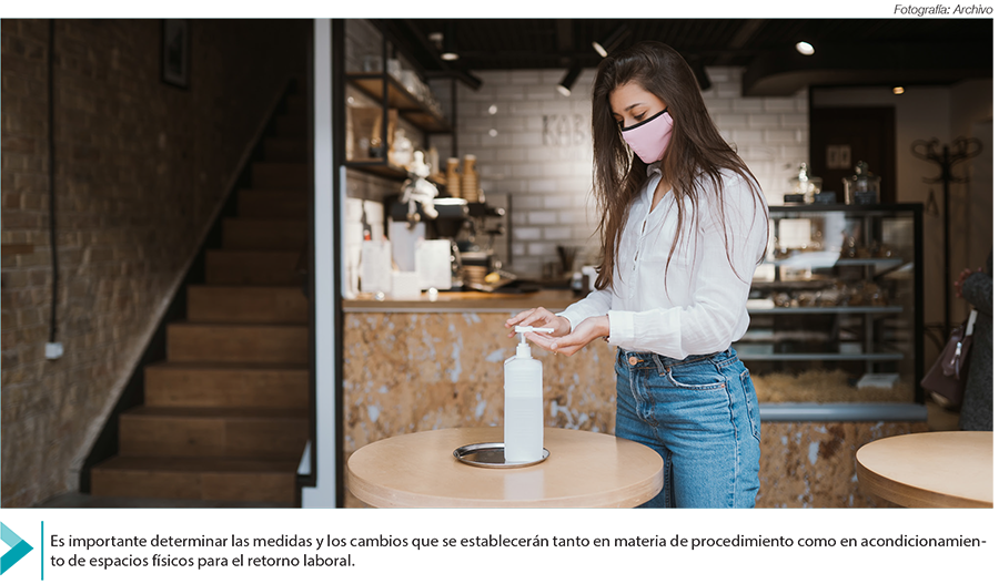 Con respecto a los controles administrativos y de procedimientos, previo al ingreso a las instalaciones de un centro de trabajo y al inicio de la jornada, se debe instalar un sistema de tamizaje que evalúe síntomas de Covid-19 y la toma de temperatura de los empleados. El distanciamiento social y la separación física de por lo menos 1.5 m, una medida que aplica no solo en la organización de los puestos de trabajo, sino también en espacios comunes como corredores, comedores, baños, vestidores y parqueos, entre otros que existan en la empresa. En las áreas de atención al público, se deben colocar pantallas divisorias o proporcionar escudos faciales para aislar al usuario del trabajador, sin perjuicio del uso de mascarillas de tela para personas clasificadas como bajo riesgo, y mascarillas certificadas para los que presenten un riesgo medio o alto.
