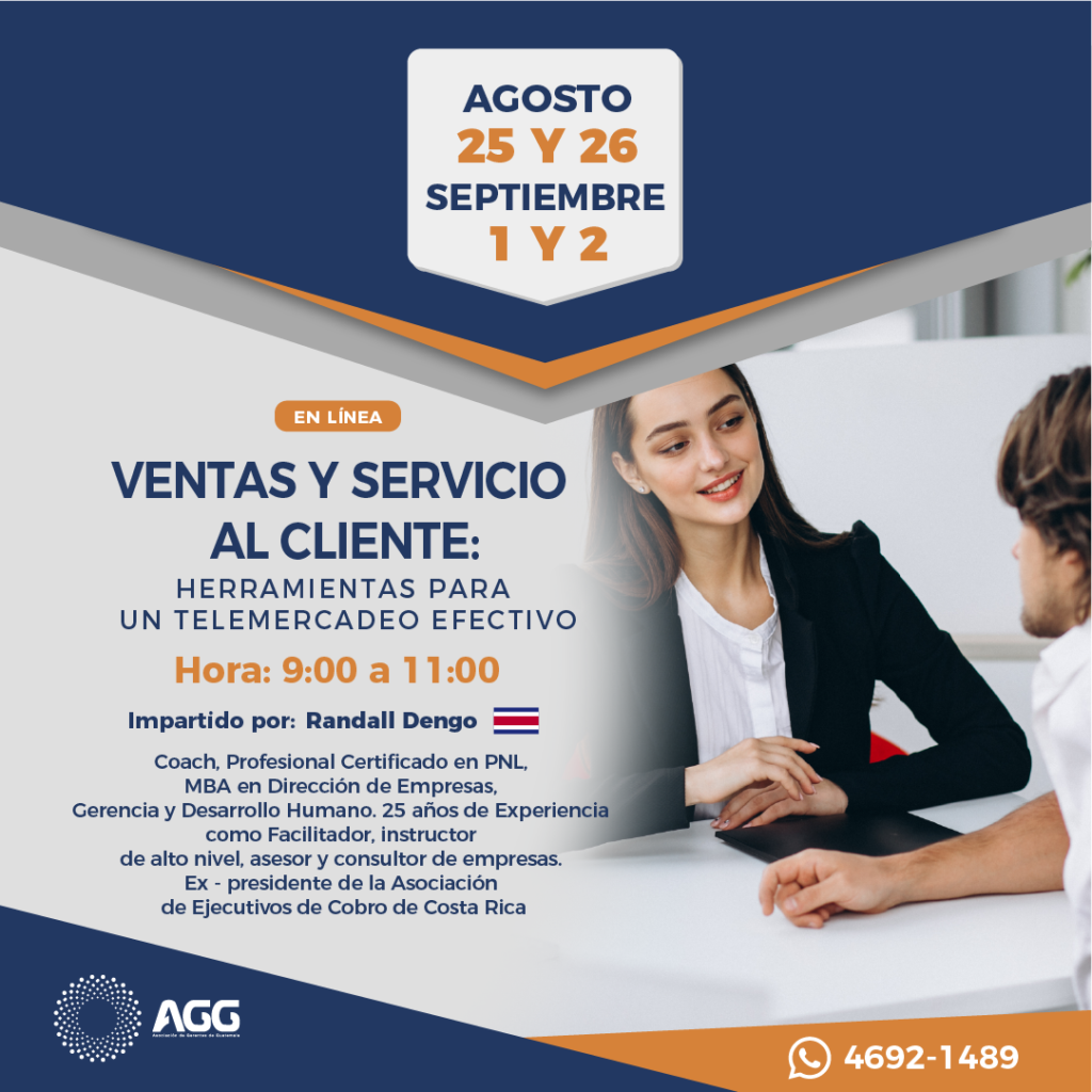 Asociación de Gerentes de Guatemala imparte las mejores técnicas de telemercadeo, inteligencia emocional y manejo de carácter, mediante el curso de “Ventas y servicio al cliente: herramientas para un telemercadeo efectivo”, en el que además aprenderá técnicas de negociación para lograr objetivos específicos de ventas, servicio y manejo de clientes difíciles.